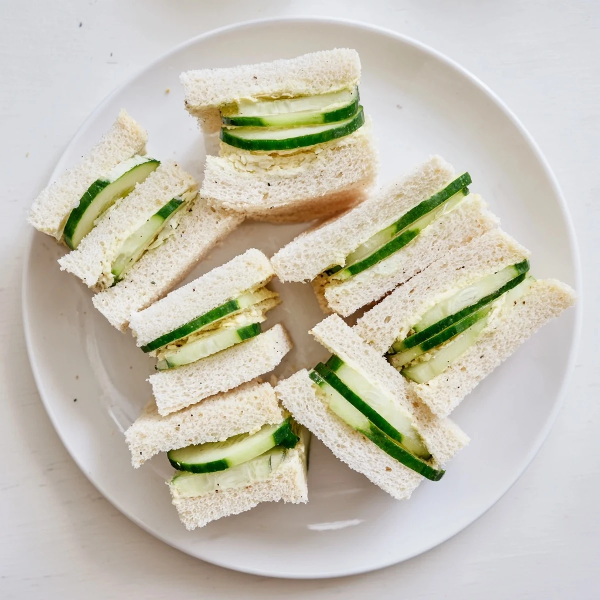 - Cucumber Sandwiches: 8 slices soft white bread crusts removed, 4 tbsp unsalted butter softened, 1/2 English cucumber thinly sliced, Pinch of salt, Freshly ground black pepper