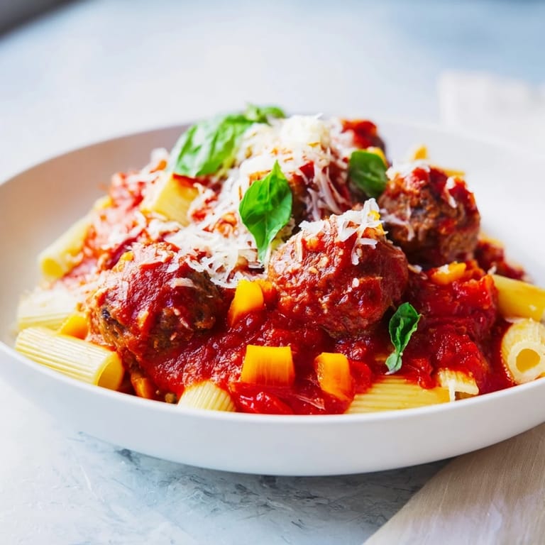 Save A hearty, one-pan Italian dish featuring tender meatballs simmered in a rich tomato sauce with pasta and melted cheese, perfect for a comforting family dinner.