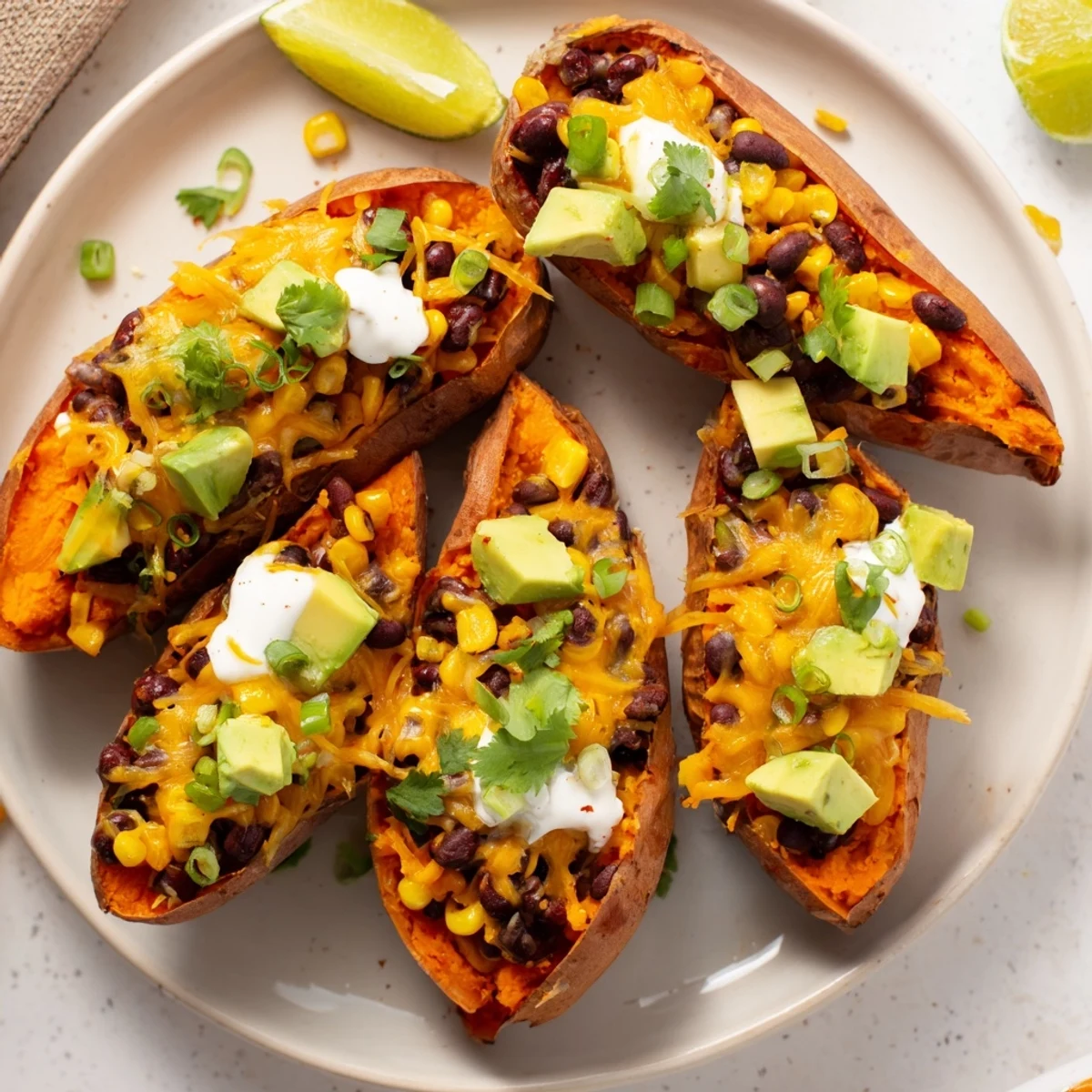 Save Sweet potatoes are roasted until tender and topped with a hearty flavorful mix of black beans corn cheese and fresh garnishes for a satisfying hands-off weeknight dinner.