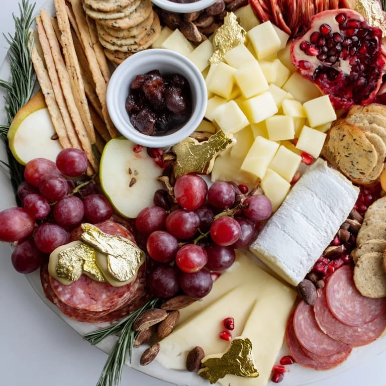 Take your time arranging the ingredients to create an inviting and balanced board. Use small bowls to contain loose items like nuts and chocolate coins so they don't scatter. Highlight the pear and dried figs as visual centerpieces to evoke the holiday theme. For extra sparkle, delicately place edible gold leaf accents across cheeses and sweets.