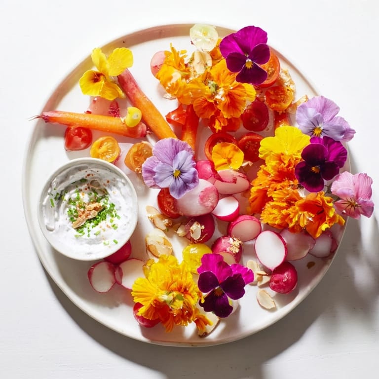 Serve: Serve immediately, inviting guests to combine dips, vegetables, and edible flowers as desired.