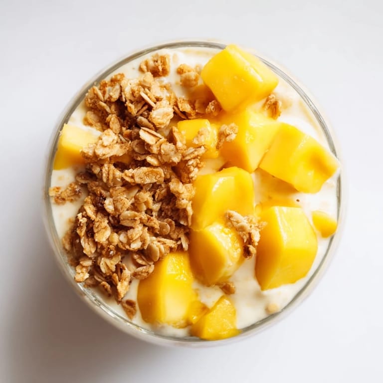 Don't skip the granola—it's the one thing that gives you actual texture contrast and keeps this from feeling like you're eating baby food. The granola also stays crunchy if you add it right before eating, which takes about five extra seconds but completely changes the experience. Fresh mango slices on top are optional but they add a little pop of brightness and remind you why you made this in the first place.