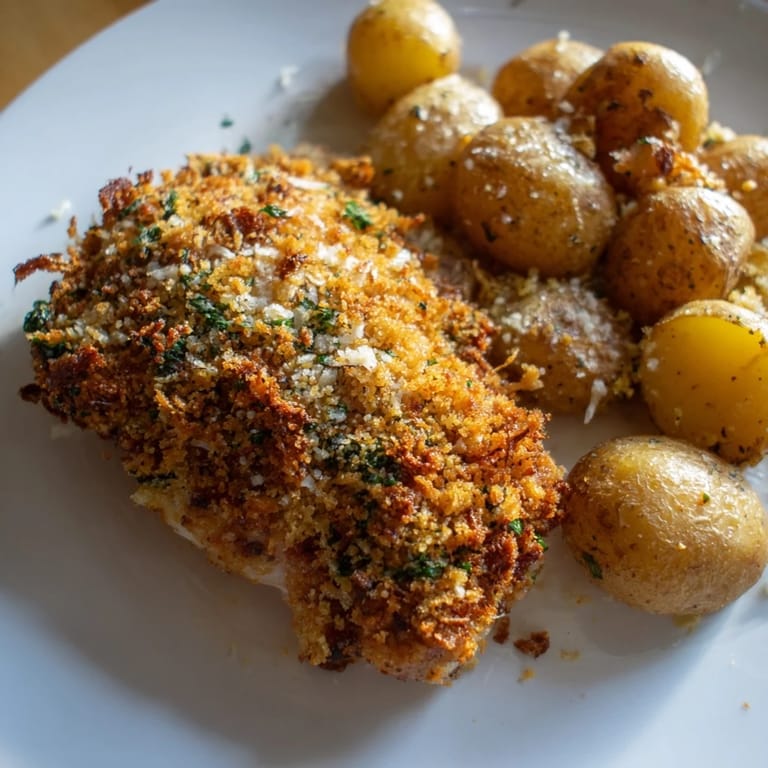 Save Juicy chicken breasts coated in a flavorful Parmesan crust, baked to golden perfection alongside crispy roasted potatoes. A satisfying, family-friendly meal with irresistible crunch and flavor.