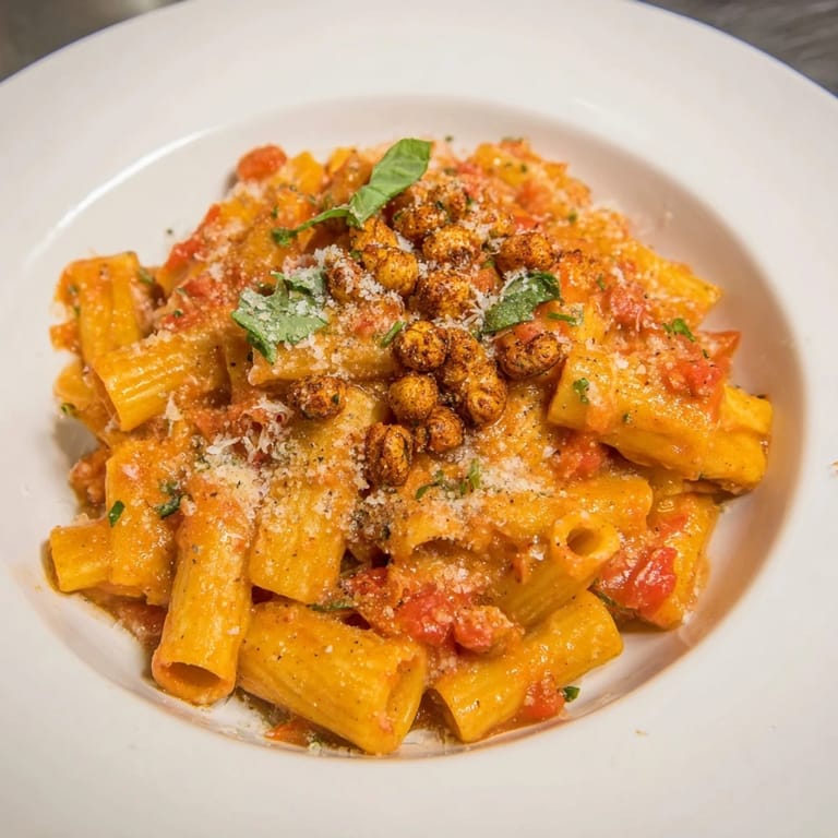 Save A bold, flavor-packed pasta dish featuring a fiery arrabbiata sauce and crispy roasted chickpeas for an irresistible crunch.